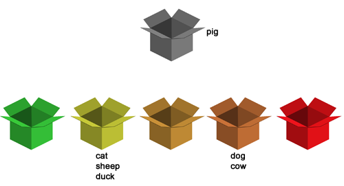 Todavía necesito aprender las palabras “dog” y “cow”. Ninguna de ellas puede aparecer en este momento para que las palabras no se repitan muy pronto. Por lo tanto, el programa selecciona otra palabra de la caja gris que aún no ha sido probada. Es la palabra “pig”. Cometo un error, por lo que se mueve a la caja 4.