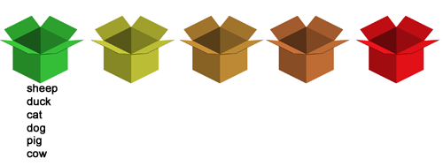 La actividad continúa así que el programa intentará repetir las palabras que no conoces lo antes posible. Siempre tienen prioridad las palabras en las cajas más bajas. En este momento, como la única palabra que no conozco es “dog”, el programa intentaría seleccionar nuevamente la palabra “dog”, pero no lo permitiremos. La palabra ahora está almacenada en mi memoria a corto plazo (la vi hace un instante). Por lo tanto, esperaré un poco para ver si realmente no conozco la palabra o si fue solo un error tipográfico, etc. Mientras tanto, el programa seleccionará gradualmente algunas palabras más de la caja gris. Por ejemplo, “sheep”, “duck”, que respondo correctamente y las envío a la caja n 2, y “cow”, donde cometo un error y se mueve a la caja 4.